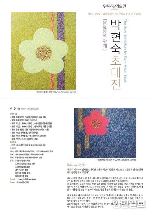 한민일보 서울포커스 진광성 기자 | 수원시 북수원도서관이 3월 22일까지 북수원도서관 1층 갤러리에서 ‘우리시 예술인 박현숙 초대전-관계(Relation)’를 개최한다.
