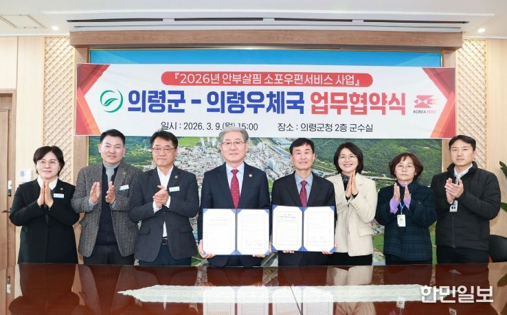 한민일보 서울포커스 김은금 기자 | 의령군과 의령우체국(우체국장 반종률)은 지난 9일 고립된 위기가구를 발굴하고 사회적 관계망을 강화하기 위한 ‘안부살핌 소포우편서비스’ 업무협약을 체결했다.