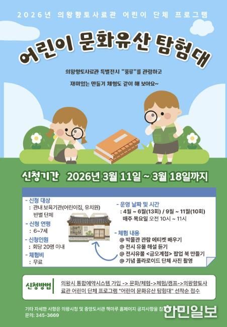 한민일보 서울포커스 전희주 기자 | 의왕시 향토사료관이 오는 4월부터 6월, 9월부터 10월 매주 목요일에 어린이 단체 체험프로그램 ‘어린이 문화유산 탐험대’를 운영한다.