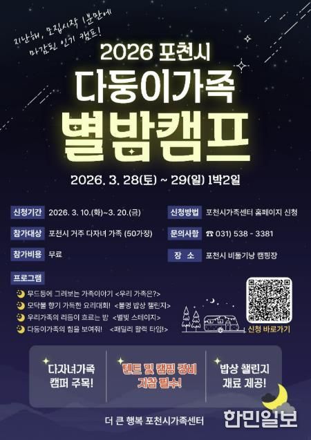 한민일보 서울포커스 심기옥 기자 | 포천시 더 큰 행복 포천시가족센터는 다자녀 가족의 가족 친화 문화 참여 기회를 확대하고 가족 간 교류 활성화를 지원하기 위해 ‘2026 포천시 다둥이가족 별밤 캠프’ 참여 가족을 모집한다.