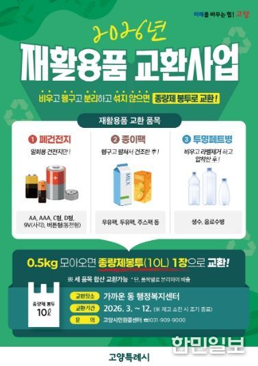 한민일보 서울포커스 김은금 기자 | 고양특례시 덕양구 창릉동은 주민들의 자원 재활용 참여를 확대하고 올바른 분리배출 문화를 정착시키기 위해 ‘2026년 재활용품 교환사업’을 운영한다고 밝혔다.