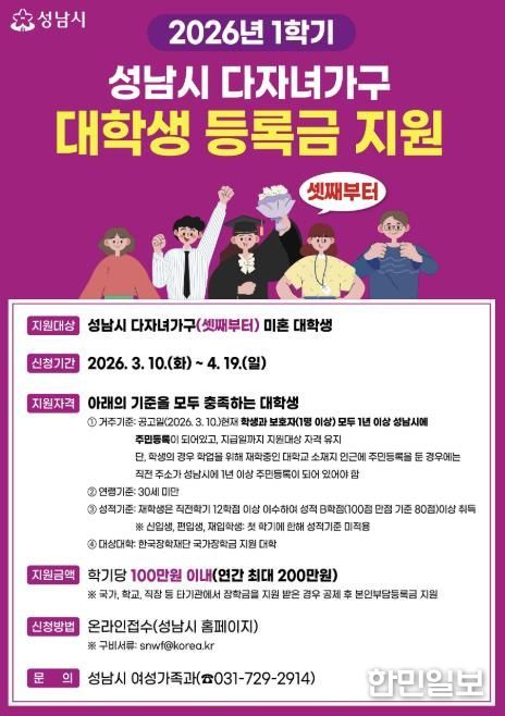 한민일보 서울포커스 김성혜 기자 | 성남시는 다자녀가구의 경제적 부담을 덜기 위해 셋째 이상 대학생에게 학기당 최대 100만원(연 200만원)의 등록금을 지원한다고 12일 밝혔다.