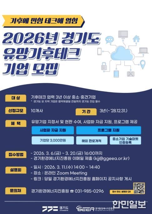 한민일보 서울포커스 김윤이 기자 | 경기도와 경기환경에너지진흥원이 기후위기 대응을 선도할 혁신 기술 보유 기업을 발굴하기 위해 오는 3월 20일까지 ‘2026년 경기도 유망 기후테크 기업’ 10곳을 모집한다.