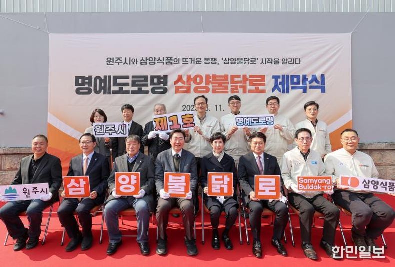한민일보 서울포커스 임경복 기자 | 원주시는 지난 11일 우산동 삼양식품 원주공장 인근에서 원주시 제1호 명예도로명인 ‘삼양불닭로’ 제막식을 열었다. 이날 행사에는 원강수 시장과 김정수 삼양식품 부회장, 김동찬 삼양식품 대표 등 관계자 30여 명이 참석했다.