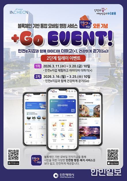 인천시는 서비스 개시를 기념해 3월 11일부터 3월 25일까지 시민이 앱 주요 기능을 직접 체험할 수 있는 “인천e지갑과 함께 아이디어 더하고(+), 건강하게 걷기(Go)!” 릴레이 이벤트를 진행한다.