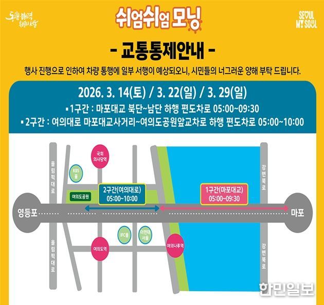 한민일보 서울포커스 최성훈 기자 | 서울시는 3월 14일 오전 7시부터 9시까지 차량 위주로 사용되던 도심 도로 공간을 시민들에게 개방하는 서울형 생활체육 프로그램 ‘쉬엄쉬엄 모닝’을 여의도공원 일대에서 처음 선보인다. 시민들은 걷기·달리기·자전거는 물론 유아차나 반려동물과 함께 각자의 방식으로 행사에 자유롭게 참여할 수 있다.