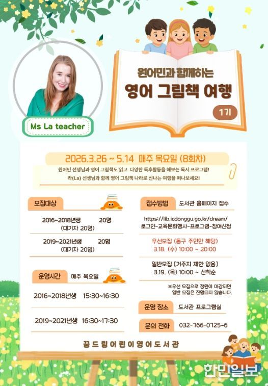 한민일보 서울포커스 백진욱 기자 | 인천 동구는 꿈드림어린이영어도서관에서 오는 18일부터 ‘원어민과 함께하는 영어 그림책 여행(1기)’ 수강생을 선착순으로 40명 모집한다고 밝혔다.