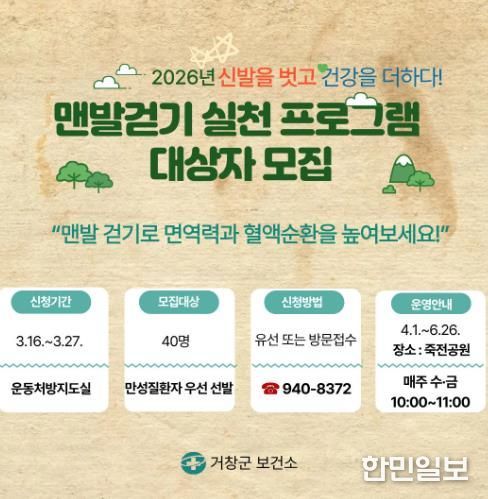 한민일보 서울포커스 김서윤 기자 | 거창군은 오는 16일부터 27일까지 맨발걷기에 관심 있는 지역주민(만성질환자 우선)을 대상으로 ‘맨발걷기 실천 프로그램’ 참여자 40명을 모집한다.