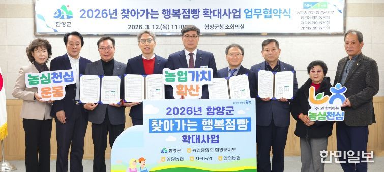 한민일보 서울포커스 김서윤 기자 | 함양군은 12일 군청 소회의실에서 농협중앙회 함양군지부, 함양·지곡·안의농협과 ‘찾아가는 행복점빵 확대사업’ 추진을 위한 업무협약을 체결했다.