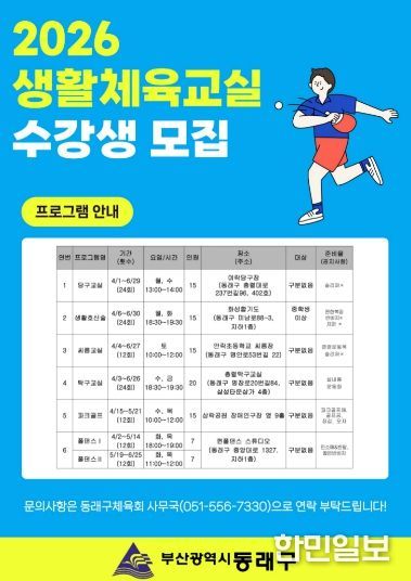 한민일보 서울포커스 최성훈 기자 | 부산 동래구는 지역 주민의 생활체육 참여 확대와 건강한 여가 활동 지원을 위해 ‘2026년 상반기 생활체육교실’ 수강생을 모집한다고 밝혔다.
