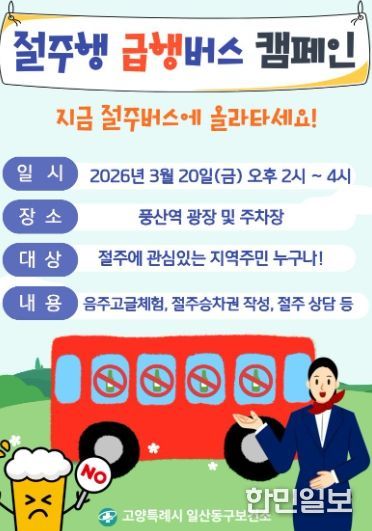 한민일보 서울포커스 김은금 기자 | 고양특례시 일산동구보건소는 건전한 음주문화 조성과 지역주민의 건강증진을 위해 오는 20일 오후 2시부터 4시까지‘절주행 급행버스 캠페인’을 운영한다.