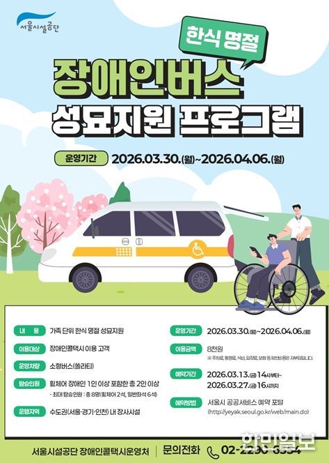 한민일보 서울포커스 국용호 기자 | 서울시설공단은 한식(4월 6일)을 맞아 장애인 가족의 성묘 이동 편의를 돕기 위해 ‘나들이 동행버스’를 활용한 성묘지원 버스를 운영한다.
