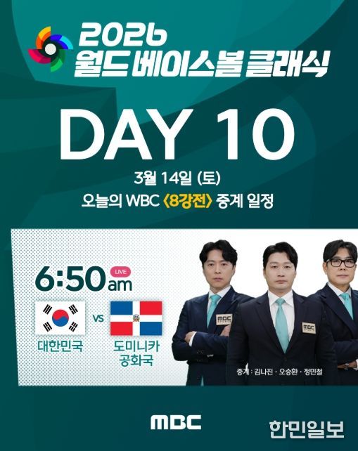 한편, MBC는 내일(14일) 토요일 오전 6시 50분부터 미국 마이애미 론디포파크에서 펼쳐지는 2026 WBC 8강전 대한민국과 도미니카 공화국의 경기를 오승환, 정민철 해설위원과 김나진 캐스터의 진행으로 마이애미 현지에서 생중계한다.
