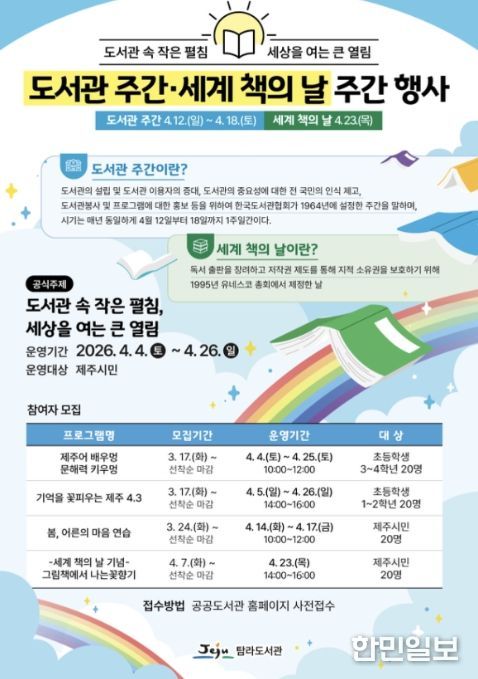 한민일보 서울포커스 김다남 기자 | 제주시 탐라도서관은 도서관 주간과 세계 책의 날을 맞아 ‘도서관 속 작은 펼침, 세상을 여는 큰 열림’을 주제로 다양한 독서문화 행사를 운영한다.