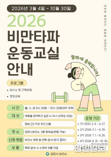 이번 프로그램은 총 4기로 운영되며, 기수별 20명씩 선착순 모집한다. 수업은 3월 4일 1기를 시작으로 10월 30일 4기까지 진행되며, 보건소 3층 회의실에서 매주 월·수·금요일 오전 9시 30분부터 10시 30분까지 운영된다. 참가 신청은 김천시보건소 방문 또는 전화(054-421-2719)로 가능하다.