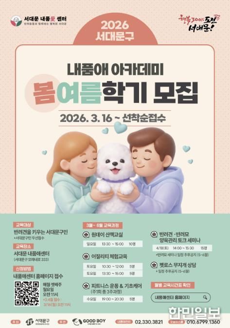 한민일보 서울포커스 김서윤 기자 | 서대문구가 이달부터 올 12월까지 관내 반려인과 주민을 위한 반려문화 교육 프로그램 '2026 내품애아카데미’를 서대문 내품애(愛)센터(모래내로 333)에서 운영한다고 13일 밝혔다.