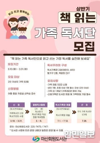 한민일보 서울포커스 김서윤 기자 | 창원시 마산회원도서관은 가족 독서문화 확산을 위해 ‘책 읽는 가족 독서단’을 운영하고 3월 10일 부터 3월 31일까지 상반기 참여 가족을 모집한다.