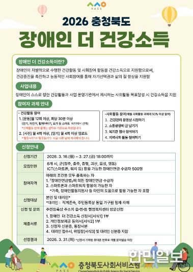 한민일보 서울포커스 임경복 기자 | 충청북도사회서비스원(원장 이장희)은 장애인의 건강증진과 능동적인 사회참여를 지원하기 위해 '장애인 더 건강소득 지원사업'을 추진하고 참여자를 모집한다고 밝혔다.