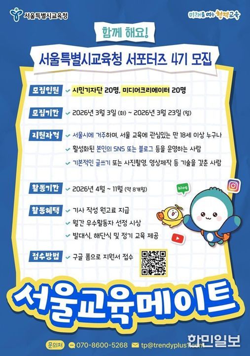 한민일보 서울포커스 국용호 기자 | 서울특별시교육청은 서울교육의 대시민 소통 접점 강화와 서울교육 관련 콘텐츠 제작을 위해 서울교육메이트(홍보 서포터즈) 4기를 3월 23일까지 모집한다고 밝혔다.