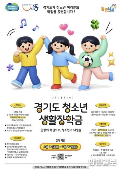 한민일보 서울포커스 유현민 기자 | 시흥시는 경제적 어려움을 겪는 청소년들이 안정적으로 학업을 이어갈 수 있도록 지원하는 ‘청소년 생활장학금’ 대상자를 3월 16일부터 27일까지 모집한다.