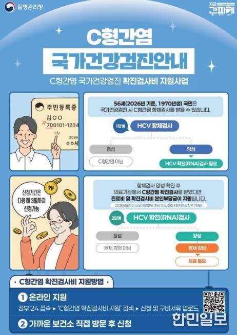 지원 대상은 56세 국가건강검진 수검자 중 시(C)형간염 항체 양성 결과를 통보받고 확진검사를 받은 자(2026년 기준 1970년생)다. 지원 금액은 시(C)형간염 바이러스 확진검사(HCV RNA) 비용의 본인부담금으로, 1회에 한해 지원되며 상한액은 7만 원이다.