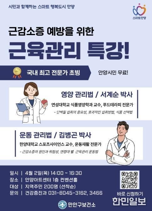 한민일보 서울포커스 김성윤 기자 | 안양시 만안구보건소는 오는 4월 2일 오후 14시부터 안양아트센터 컨벤션홀(1층)에서 ‘지역주민 근감소증 예방을 위한 영양·운동관리 건강강좌’를 개최한다고 16일 밝혔다.