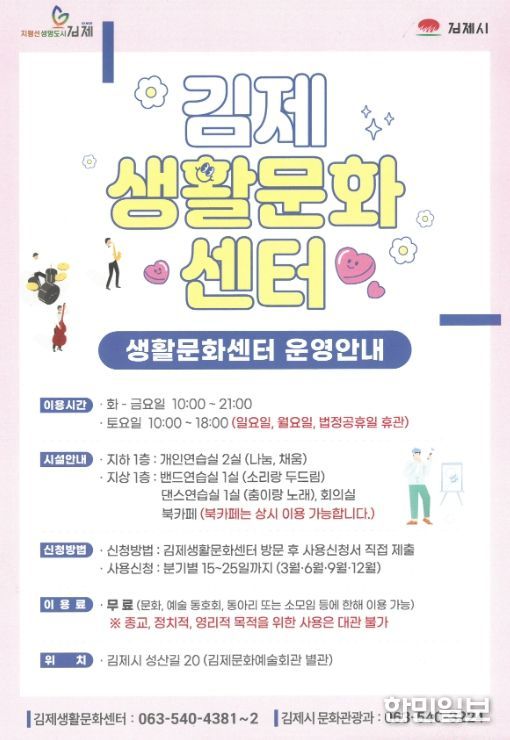 한민일보 서울포커스 박용남 기자 | 김제시는 시민 문화활동 공간인 김제생활문화센터에서 2분기 시설 이용자를 모집한다고 밝혔다.
