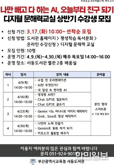 한민일보 서울포커스 임광현 기자 | 부산광역시교육청서동도서관(관장 이진옥)은 오는 4월 9일부터 30일까지 매주 목요일 서동도서관 별관에서 지역 주민 10명을 대상으로 상반기 디지털 문해력 교실 ‘나만 빼고 다 하는 AI, 오늘부터 친구되기’를 운영한다.