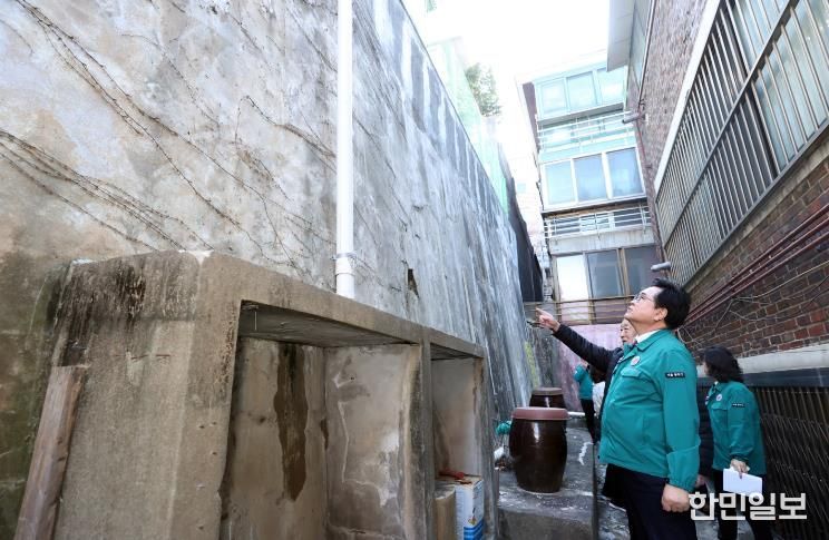 박 구청장은 13일, 사당4동과 상도1동을 방문해 노후 석축·옹벽과 노후 축대·경사면 등의 손상 여부와 안전 상태를 점검했다.