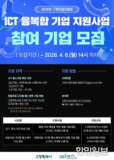 한민일보 서울포커스 김은금 기자 | 고양산업진흥원이 ‘2026 고양 ICT 융복합 지원사업’ 참여 기업을 모집한다.