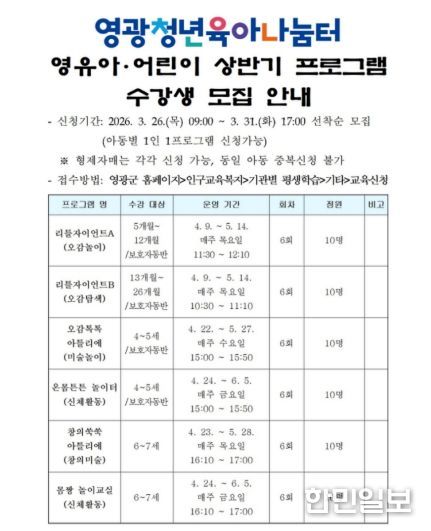 한민일보 서울포커스 박용남 기자 | 영광군은 ‘영광청년육아나눔터’에서 영유아・어린이를 대상으로 하는 「2026년 상반기 프로그램」 수강생을 모집한다고 밝혔다.