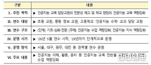 교육부와 한국교육학술정보원(원장 정제영)이 협력하여 개발한 이 연수 과정은 교육 내용으로 인공지능 기술의 이해·활용·윤리에 대한 사항을 포괄하고 있으며, 교과 수업과 연계된 교수·학습 역량을 강화하는 데 중점을 둔 것이 특징이다. 특히, 인공지능의 개념과 원리, 최신 인공지능 기술의 교육적 활용, 인공지능 윤리와 사회적 영향 등을 균형 있게 반영하여 인공지능 전반을 아우르는 연수 체계를 구축했다.