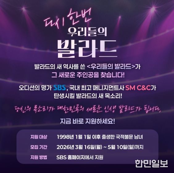 제작진은 “지난해 많은 관심과 사랑 덕분에 ‘우리들의 발라드’가 다시 한 번 새로운 주인공을 찾고자 한다”며 “누구나 대한민국의 새로운 인생 발라드를 부를 수 있다. 자신만의 감성을 가진 예비 발라더들의 많은 참여를 기다린다”고 전했다. 이번 참가자 공개 모집과 관련한 사항은 SBS ‘우리들의 발라드’ 홈페이지 및 ‘SBS NOW’ 인스타그램 등 디지털 계정을 통해 확인할 수 있다.