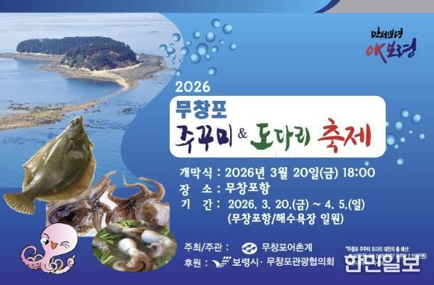 한민일보 서울포커스 임경복 기자 | 보령의 대표 수산물 축제인 ‘2026 무창포 주꾸미&도다리 축제’가 제23회를 맞아 3월 20일 개막식을 시작으로 4월 5일까지 17일간 무창포항·해수욕장 일원에서 펼쳐진다.