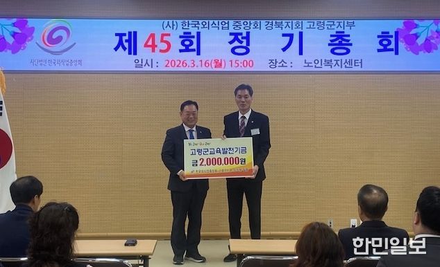 한민일보 서울포커스 임경복 기자 | 3월 16일 고령군 노인복지센터 강당에서 개최된 ‘사)한국외식업중앙회 경북지회 고령군지부 제45회 정기총회’에서 고령군지부 임직원은 지역의 교육 발전과 인재 양성을 위해 사용해 달라며 교육발전기금 200만원을 기탁했다.