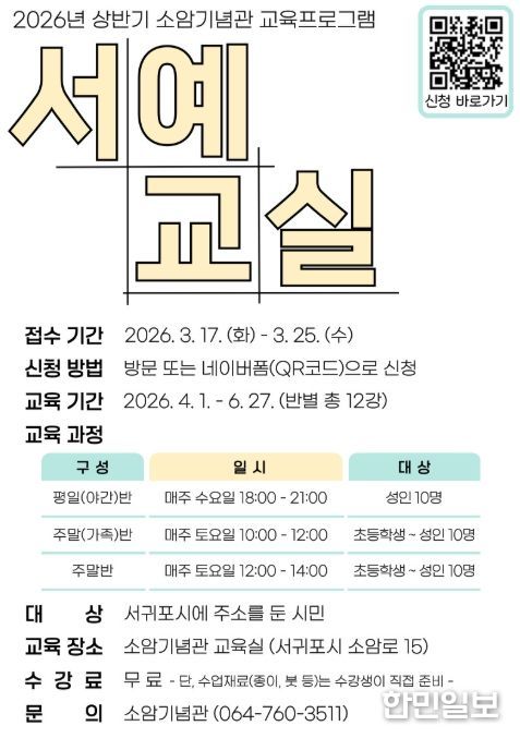 한민일보 서울포커스 김다남 기자 | 서귀포공립미술관은 4월부터 6월까지 운영되는 소암기념관 상반기 교육프로그램 ‘서예교실’의 수강생을 모집한다고 밝혔다.