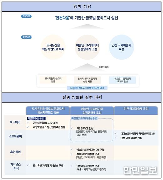 그리고 이러한 방향성 속에서 근현대 문화유산지구 조성, 인천개항도시박물관 및 인천노동산업자료관 신설, 도시유산 가치화 거버넌스 구축, 유휴공간의 예술적 전환, 예술인・크리에이터 DB 구축, 예술과 비즈니스를 연계한 ART×BIZ 매칭랩 운영, 인천예술지원허브 운영, 디아스포라영화제 국제 경쟁력 강화, 인천 국제 미술전 개최 등의 실천 과제를 제안했다.