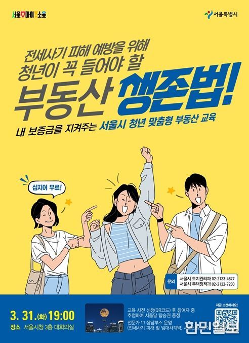 한민일보 서울포커스 국용호 기자 | 서울시는 대학생과 사회 초년생 등 청년층이 전월세 계약 절차를 올바르게 이해하고, 주거 불안을 해소할 수 있도록 돕기 위해 31일 19시 서울시청 본관 3층 대회의실에서 ‘2026 청년 맞춤형 부동산 교육’을 개최한다.