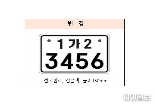새롭게 도입되는 이륜자동차 번호판은 기존보다 크기가 확대되고 디자인이 변경된다. 번호판 규격은 기존 210mm☓115mm에서 210mm☓150mm로 확대되며, 글자 색상도 파란색에서 검은색으로 변경된다. 또한, 반사 성능이 강화된 재질이 적용돼 주·야간 식별성이 개선될 예정이다.