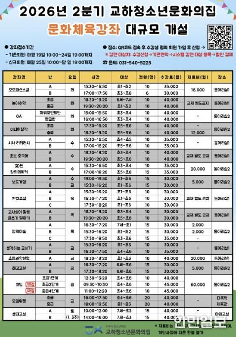 이와 함께 기존에 안정적으로 운영되며 높은 만족도를 보여준 ▲창의미술 ▲한자교실 ▲레고교실 ▲코딩 ▲생태교실 강좌 역시 지속적으로 운영되어, 청소년들에게 한층 더 넓고 깊이 있는 선택의 폭을 제공할 예정이다.