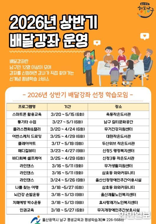 한민일보 서울포커스 기자 | 울산 남구는 지역 주민이 원하는 시간과 장소에서 배움을 이어갈 수 있는 수요자 중심 평생학습 프로그램‘2026년 상반기 맞춤형 배달강좌’를 운영한다고 17일 밝혔다.