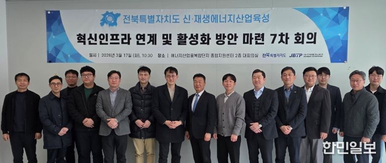 한민일보 서울포커스 임철현 기자 | 전북특별자치도는 17일 새만금 에너지산업융복합단지 종합지원센터 대회의실에서 ‘에너지 분야 혁신인프라 연계 및 활성화 회의’를 개최하고 도내 에너지 분야 혁신기관과 함께 협력사업 확대 및 신규사업 발굴 방안을 논의했다.