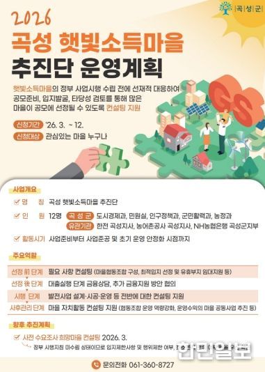 곡성군 관계자는 “햇빛소득마을 추진단을 중심으로 행정과 유관기관이 협력해 마을별 맞춤형 지원체계를 구축해 나가겠다”라며 “사전 컨설팅을 통해 사업 추진 가능성을 꼼꼼히 검토하고 더 많은 마을이 공모사업에 참여할 수 있도록 적극 지원하겠다”라고 말했다.