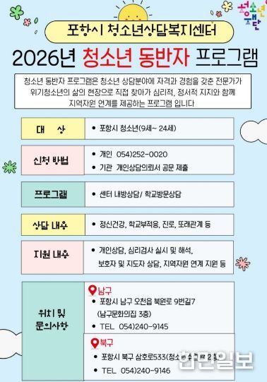 한민일보 서울포커스 임경복 기자 | 포항시청소년재단 청소년상담복지센터는 고위기 청소년을 대상으로 생활 현장을 직접 찾아가 지원하는 ‘2026년 청소년동반자 프로그램’을 연중 운영한다.