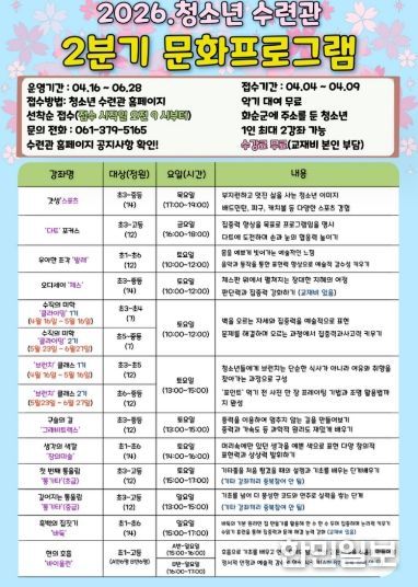 한민일보 서울포커스 박용남 기자 | 화순군 청소년수련관은 지역 청소년들의 건강한 성장을 돕고 문화·여가 활동을 지원하기 위해 2026년 2분기 문화 프로그램 참가자 166명을 선착순 모집한다고 밝혔다.
