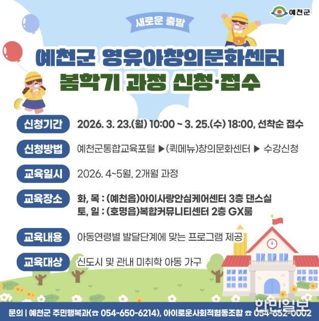 한민일보 서울포커스 임경복 기자 | 예천군은 관내 영유아의 건강한 성장과 창의력 발달을 지원하기 위해 예천군 영유아 창의문화센터 봄학기 프로그램 수강생을 모집한다.