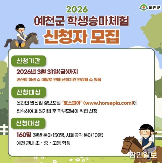 한민일보 서울포커스 임경복 기자 | 예천군은 2026년도 학생 승마체험 지원사업을 오는 31일까지 접수한다고 밝혔다.