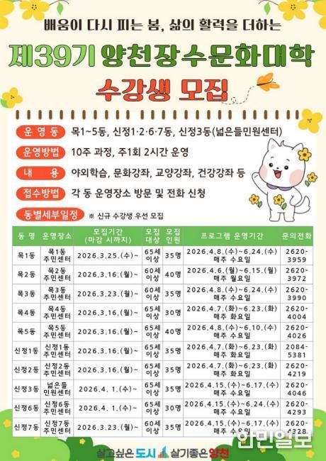 이번 제39기 장수문화대학은 4월 6일부터 6월 24일까지 목1~5동, 신정1·2·6·7동, 신정3동 넓은들민원센터 등 10개 동에서 동별 9주 과정으로 운영된다. 이후 전체 수강생이 함께하는 통합 수료식으로 마무리될 예정이다.