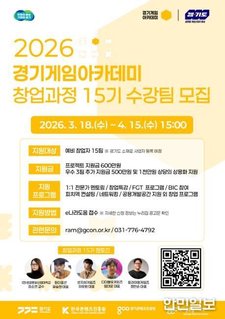 한민일보 서울포커스 김윤이 기자 | 경기도와 경기콘텐츠진흥원이 대한민국 게임산업의 미래를 이끌어갈 ‘2026 경기게임아카데미’ 창업과정 15기 수강생을 4월 15일까지 모집한다.