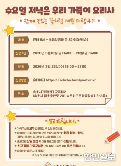 한민일보 서울포커스 임경복 기자 | 속초시가족센터는 2026년 가족 유형별 특성과 수요를 반영한 맞춤형 프로그램을 운영하며 가족 간 소통과 정서적 유대 강화에 나선다.